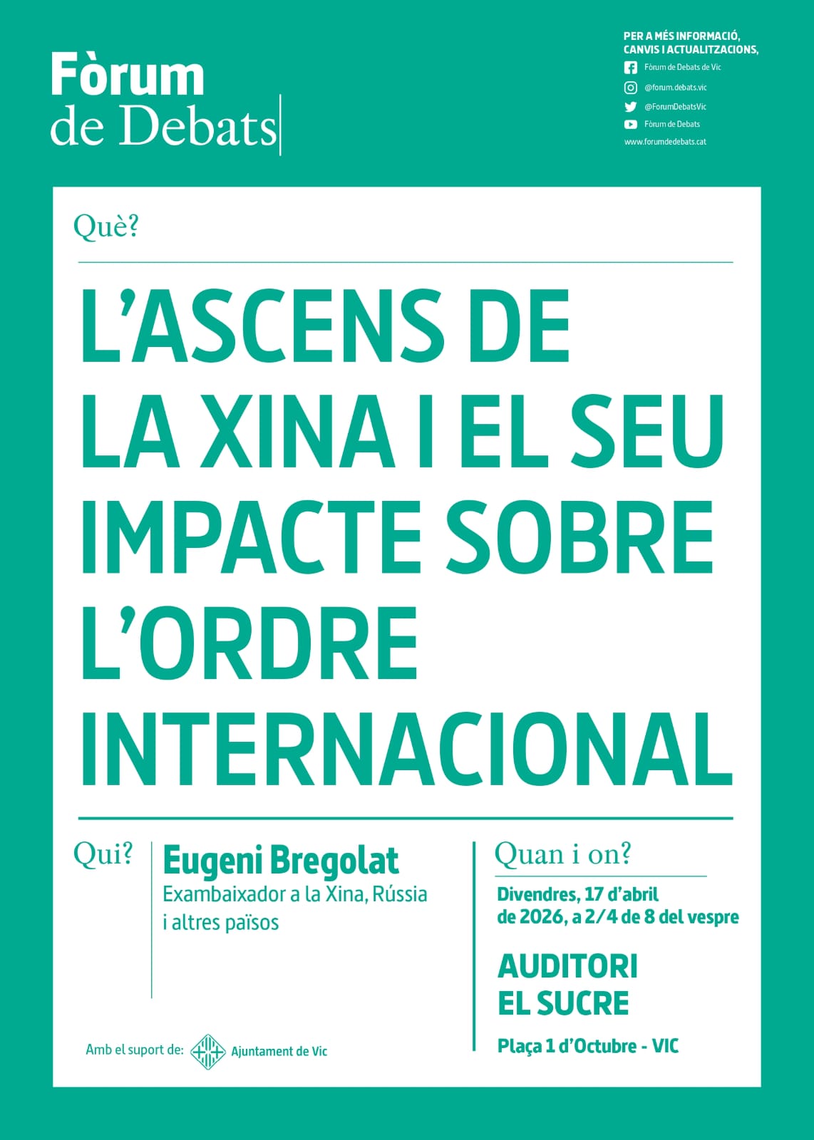 "L'ascenç de la Xina i el seu impacte en l'ordre internacional.". El pròxim divendres dia 17 d'abril de 2026, a les 19:30 h, tindrà lloc a l’Auditori "El Sucre" (Plaça 1 d’Octubre, Vic) la conferència: La ponència anirà a càrrec […]